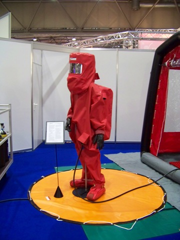 Die Firma Isotemp – Heinrich Vorndamme oHG zeigt auf dem Stand des Werkfeuerwehrverbandes einen Chemikalienschutzanzug Typ 3 mit Außenluftversorgung.