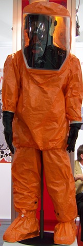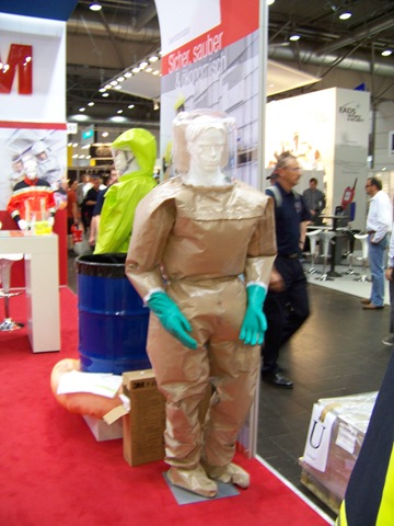 Daneben gibt es einen Schutzanzug aus Tychem F von Isotemp, der in drei Teile aufgeteilt ist. Füßlinge, Hose und Überwurf. Zu sehen in Halle 3, beim Stand der Firma selbst.
